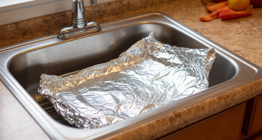 Положите в раковину фольгу и возьмите сковороду: весь жир и нагар отойдет моментально - без усилий и чистящих средств